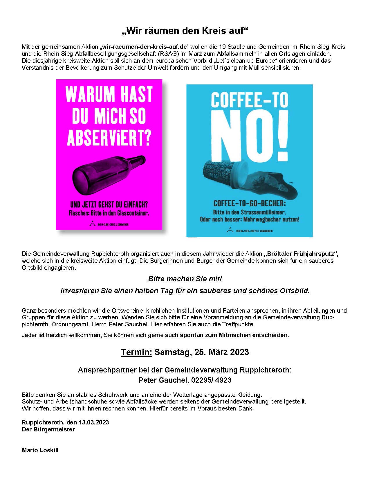 Der Frühling hat seine ersten Vorboten ins Land geschickt. Die Natur erwacht, die Blüten sprießen und es wird grüner und grüner. Der richtige Zeitpunkt für einen Frühjahrsputz, zu dem der Heimatverein Winterscheid auch in diesem Jahr wieder aufruft.